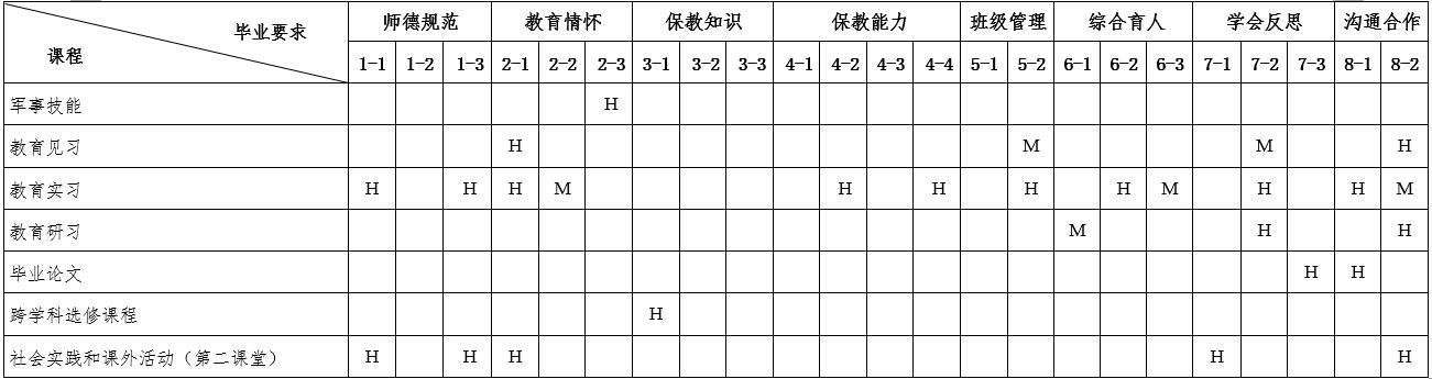 根据各门课程或实践活动的教学目标与学生能力达成的相关度,填写如下关系矩阵。用符号表示相关度:H-高度相关;M-中等相关;L-弱相关。