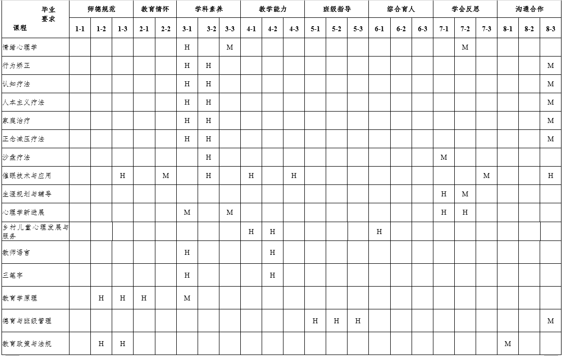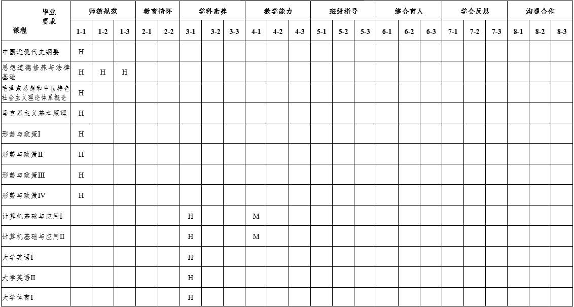 根据各门课程或实践活动的教学目标与学生能力达成的相关度,填写如下关系矩阵。用符号表示相关度:H-高度相关;M-中等相关;L-弱相关。