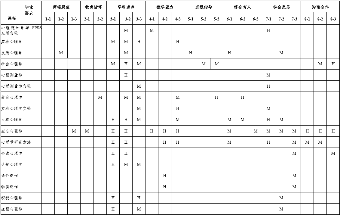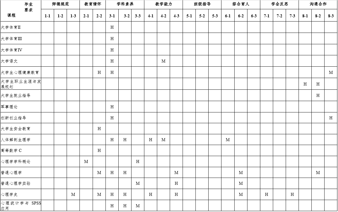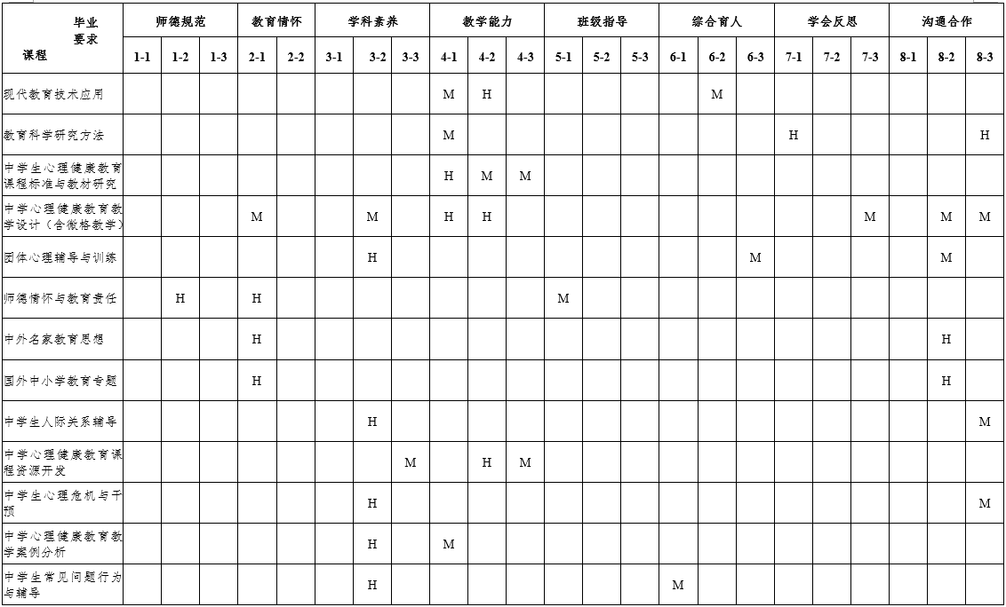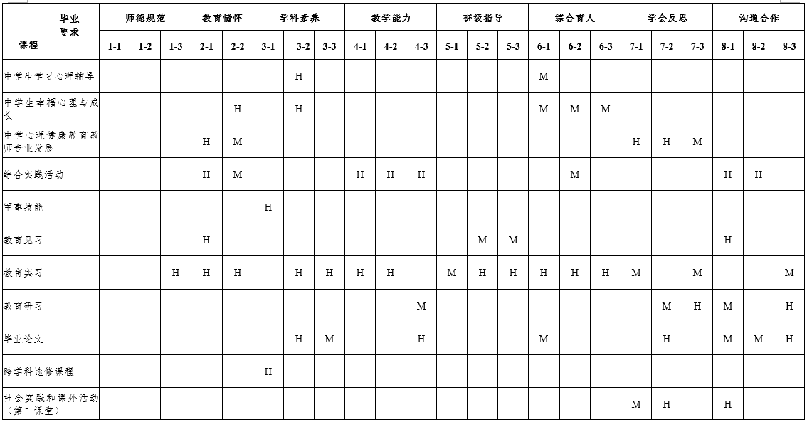 7.具有终身学习与专业发展意识。明确专业发展的方向,了解并掌握教师专业发展的基本知识和实现路径,掌握教育科学研究的基本方法,具有基于教育实践的教研能力。了解国内外基础教育改革发展动态,能够适应时代和教育发展需求自主学习,并具有对自己的职业生涯进行初步规划的能力。掌握心理健康教育活动的反思的基本方法和技能,具有一定的创新意识,能运用批判性的思维方法,学会分析和解决中学教育教学问题。 |