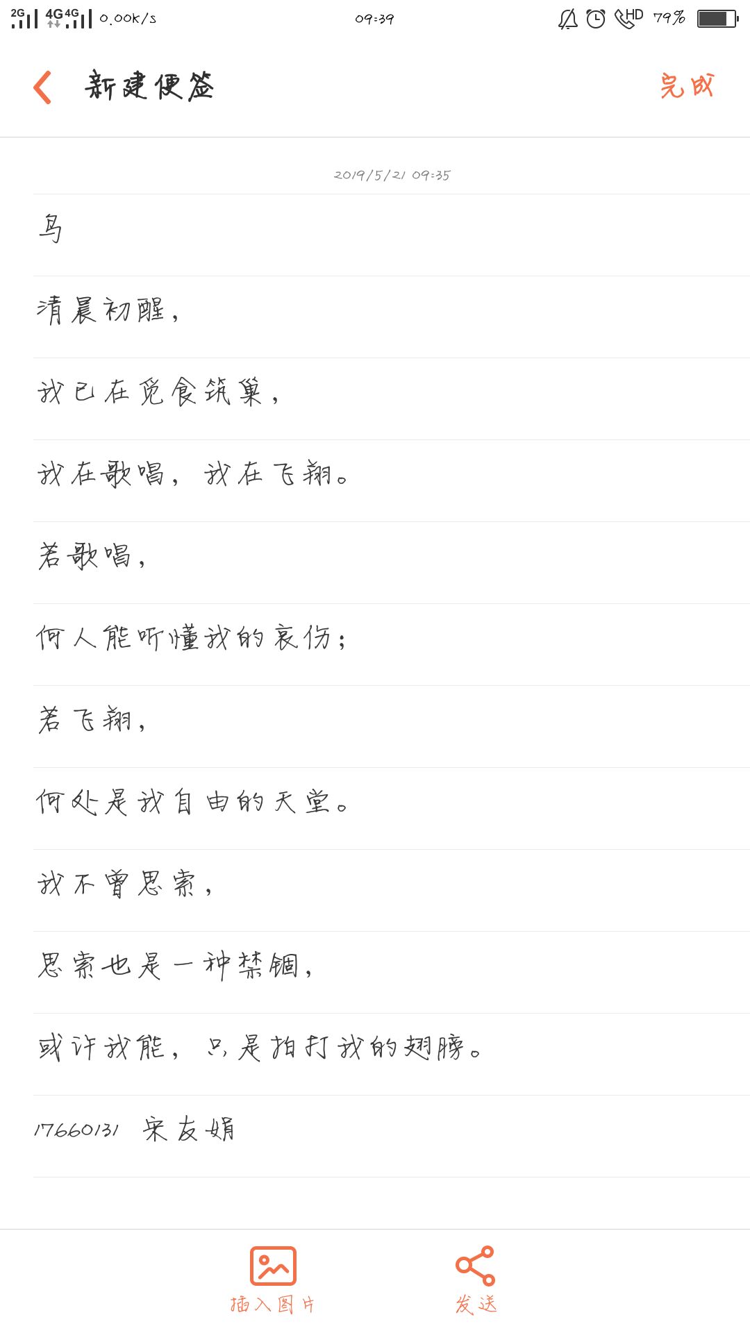 黎老师还结合德育模式知识、环境育人理论,于5月21日带领同学们参观了校园内的鸟岛。师生们与怡心湖管理人员就怡心湖、鸟岛的规划建设、养鱼护鱼的目的、水体保护、学校排水系统的建设等问题进行了咨询。同学们从陆地上绕岛对白鹳等鸟类的生存情况做了细致观察。回到教室后,结合对《去年的树》的鉴赏与德育主题,以“衡师鸟岛”为范畴进行了创作,文体与字数不限。短时间内,所有同学都写出了作品,以诗歌为主,短的三五句十几个字,长的几十行达二三百字。大部分作品都体现了对生命、对生命之间的关系、对人与自然关系、对校园环境建设的诗意表达或理性思考。作品在班群进行了展示、分享,使其育人价值尽可能最大化。