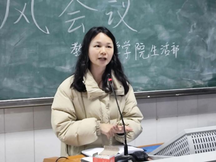 会上,辅导员申鑫玉老师表明近期将不定时开展学工部与辅导员查寝工作,强调到宿舍报修问题及正确清晰的报修流程,并明确指出将加强加严晚归检查,阐述相关的惩处措施,最后提醒学生们不要在宿舍区域内喂养流浪动物,以确保个人的人身安全。