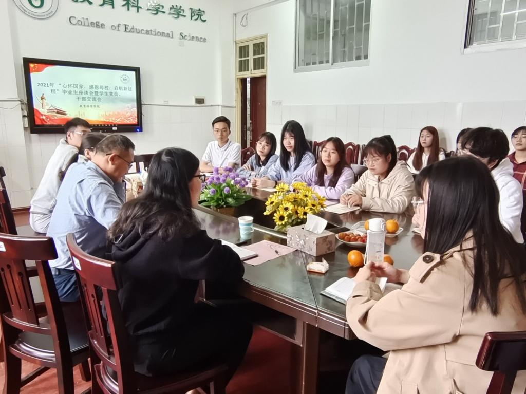2021届毕业生们即将毕业离校,为了祝福毕业学子,同时使同学们认识到自己角色的改变,完成从“大学生”到“职业人”角色的过渡,5月19日下午,我院2021年毕业生座谈会在文综楼B309会议室举行。本次座谈会由辅导员杨威老师主持,党总支副书记刘辰、副院长郑志辉、心理系主任阳晓艳老师出席,我院2021届毕业生代表参加。