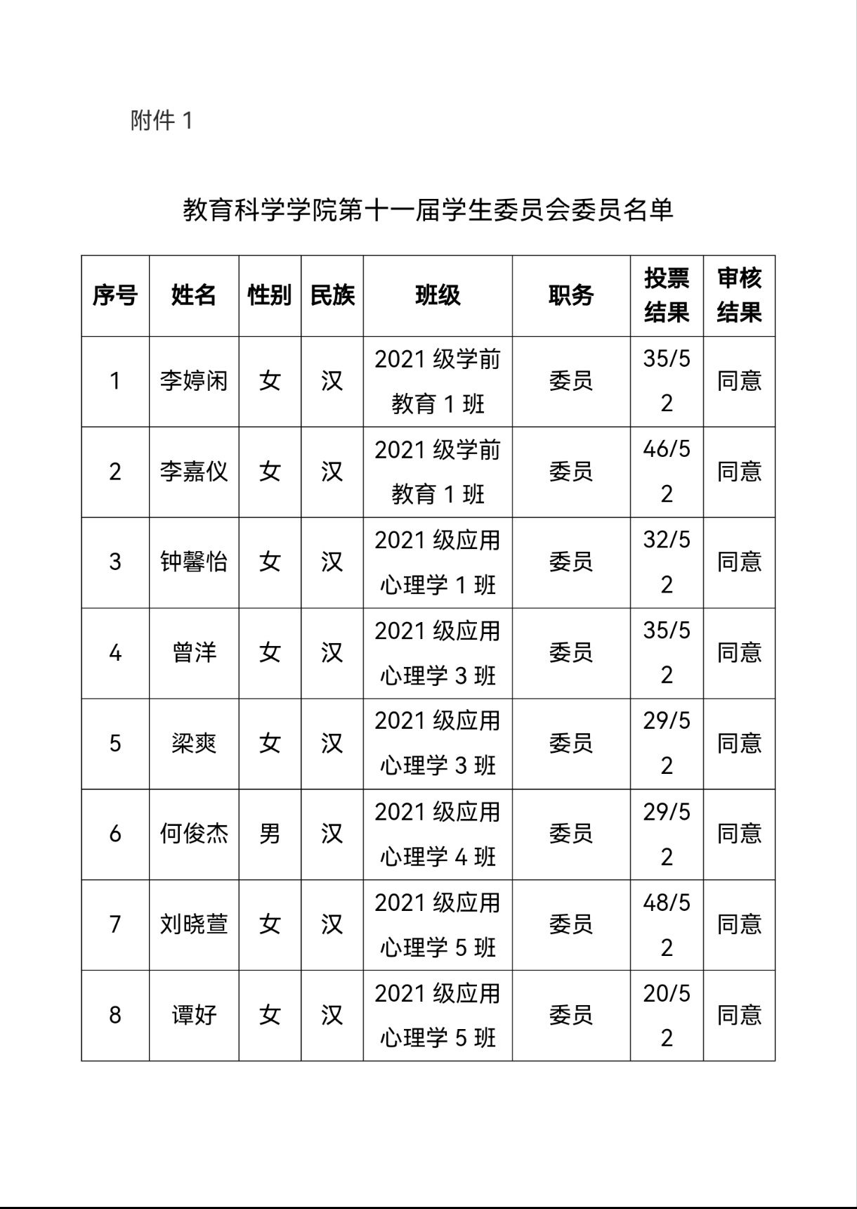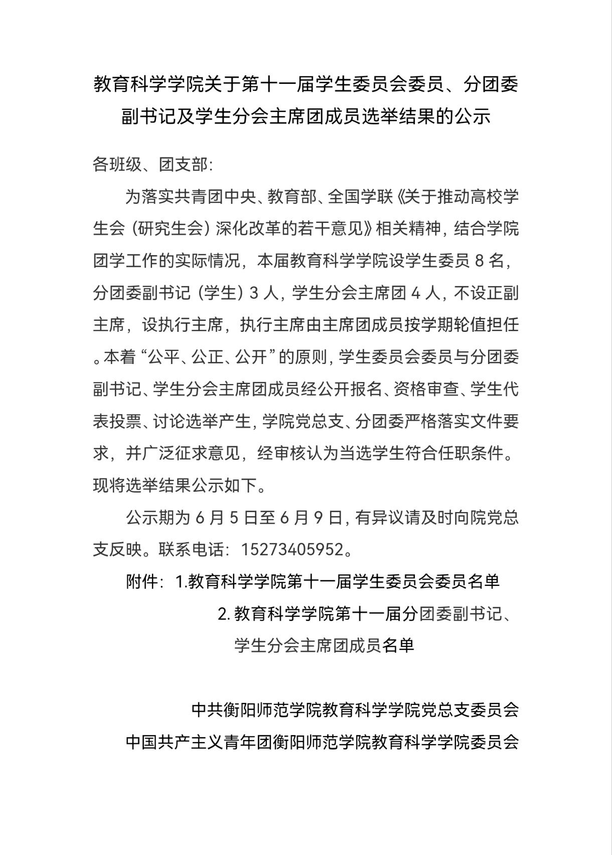 第十一届学生委员会委员、分团委副书记及学生分会主席团成员选举结果的公示