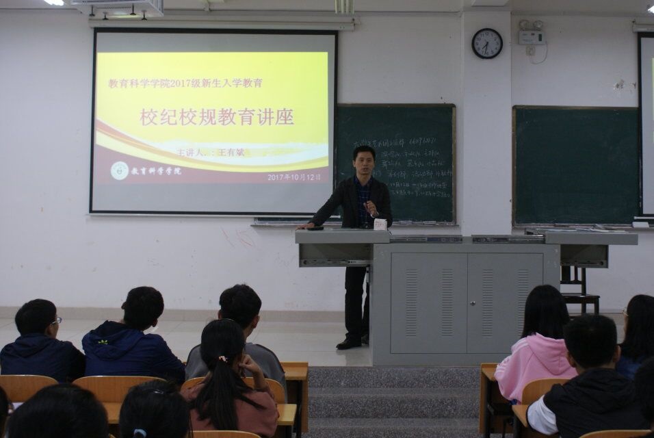 为了帮助2017级新生尽快熟识学校各种规章制度,了解相关奖惩措施,进而养成良好的学习习惯和生活习惯。我院于10月12日晚在理科楼南楼112教室召开了安全教育暨校纪校规教育讲座。本次讲座是由我院17级学生辅导员王有斌老师主讲,全体2017级新生均参加了讲座。