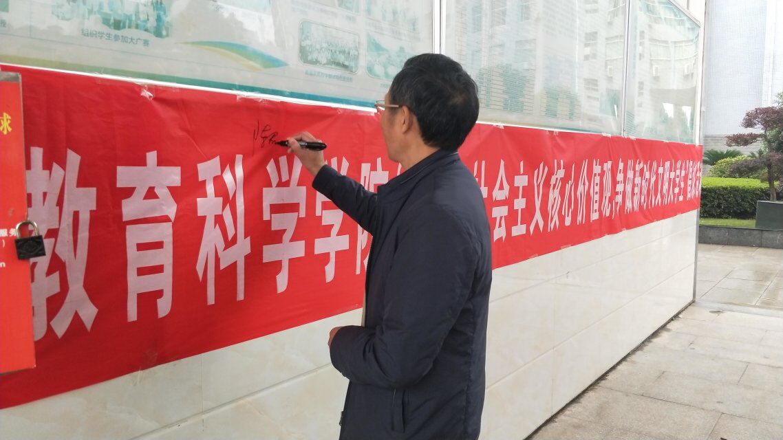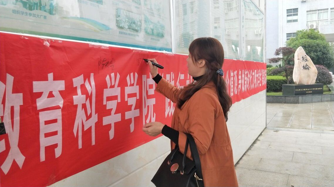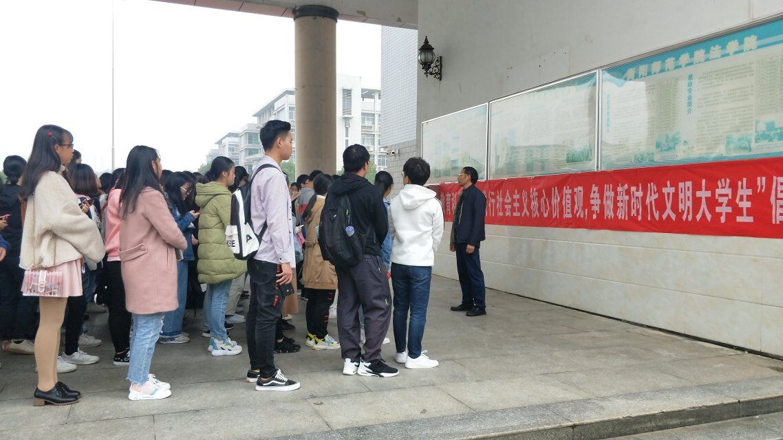 10月22日上午11:00我院于文综楼AB大厅举办以“践行社会主义核心价值观,争做新时代文明大学生”为主题的文明倡议签名活动。我院党总支书记陈君生、党总支副书记罗耒英以及bv伟德国际1946全体学生参加此次活动。