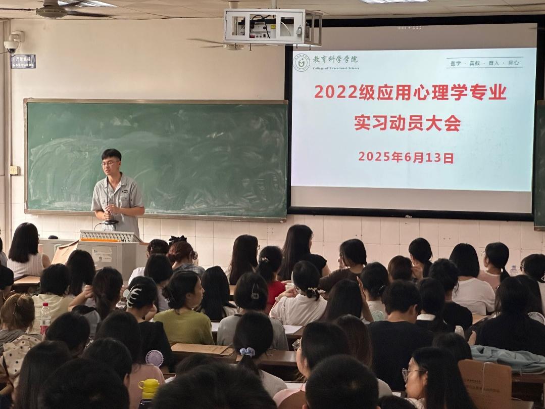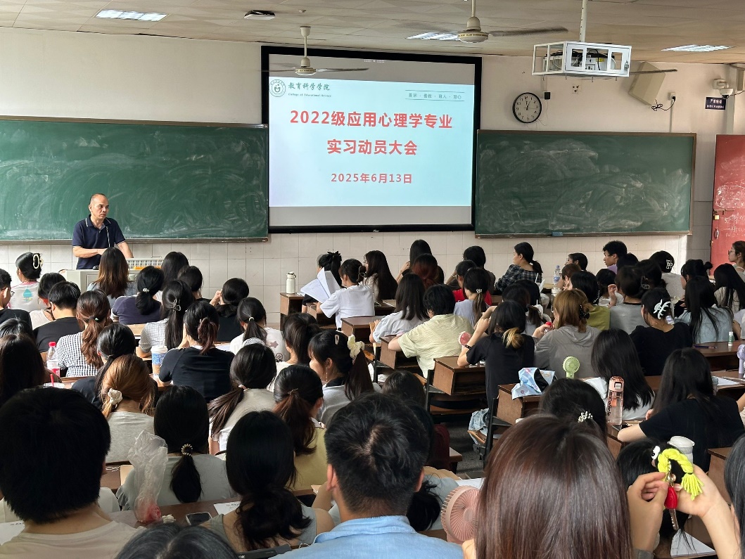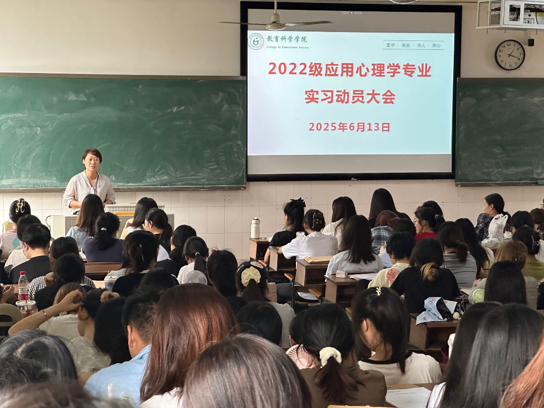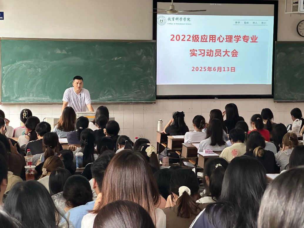 为贯彻理论联系实际的教学原则,提升师范生专业实践能力,确保2022级应用心理学专业教育实习工作顺利推进,我院心理学系于2025年6月13日中午在西校区行知楼302多媒体教室召开了教育实习动员大会。会议由心理学系主任刘罗主持,副院长梁文明、学工办主任兼2022级辅导员邹伶俐、心理学系教师卢鑫及2022级应用心理学专业全体183名本科生参加了本次会议。