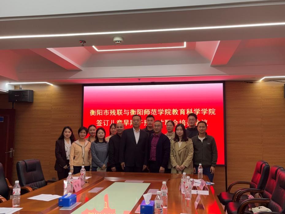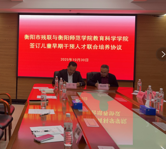 为助力衡阳市残疾人康复服务专业人才培养,推进我院学前教育专业内涵建设,拓宽学前教育专业毕业生就业渠道,11月3日上午,我院与衡阳市残疾人联合会在该联合会中心大类七楼会议室召开联合培养儿童早期干预人才座谈会并签署“儿童早期干预”微专业人才联合培养合作框架协议。院长郑志辉和衡阳市残疾人联合会副理事长王宏参加座谈会并出席签约仪式。