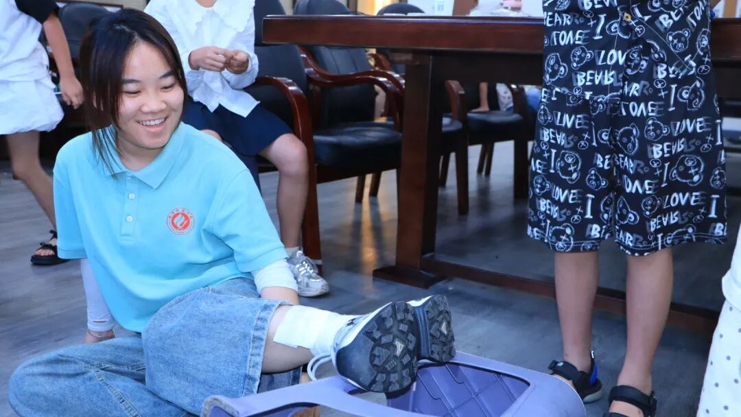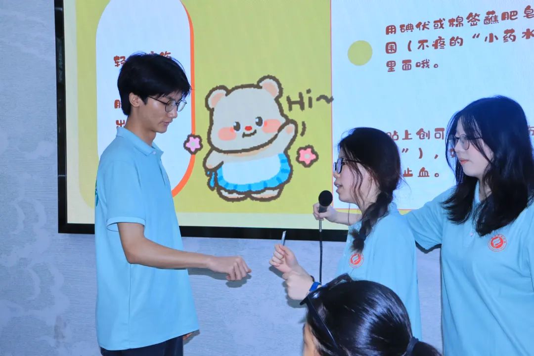 户外运动受伤处理是活动的“实战课”。志愿者谭文涛、罗思琪、谢欣奕、廖莎通过情景演练,示范了擦伤、扭伤等意外的正确处理流程。孩子们上台模仿包扎、冰敷等动作,在实践中掌握“不动、冰、抬、压”的处理口诀,朗朗上口的口诀让自救知识变得浅显入心。