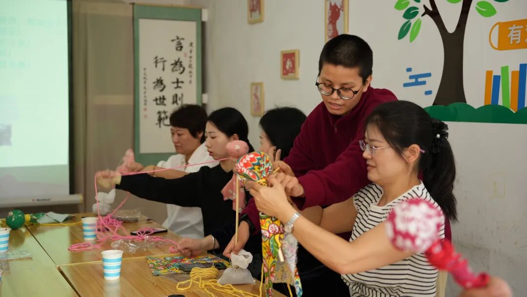 手工活动中帮帮团小导师从驱邪避瘟的端午习俗讲起,深入解读艾草祛湿散寒的药用价值以及艾灸等养生应用,让传统智慧可触可感。随后的艾草锤制作环节,帮帮团小导师分步示范填充艾草、缝制锤体的技巧,师生们专注投入,亲手缝制出一个个承载安康寓意的艾草锤。