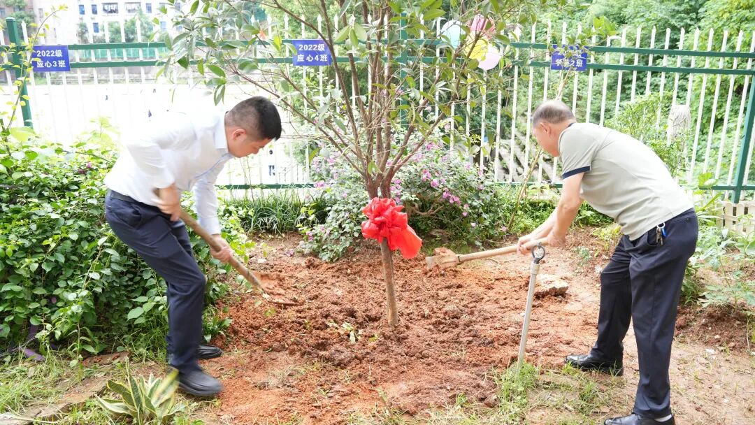 在志愿者的引导下师生共同走向社区小花园,校团委书记朱贤友和学院党总支副书记陈界峰为象征希望的桂花树培根育苗,同时朱书记指出要丰富高校学生劳动教育内容和形式,激发青年的劳动兴趣,帮助青年养成良好的劳动习惯,让青年真切感受到劳动有益身心,劳动创造美好生活。