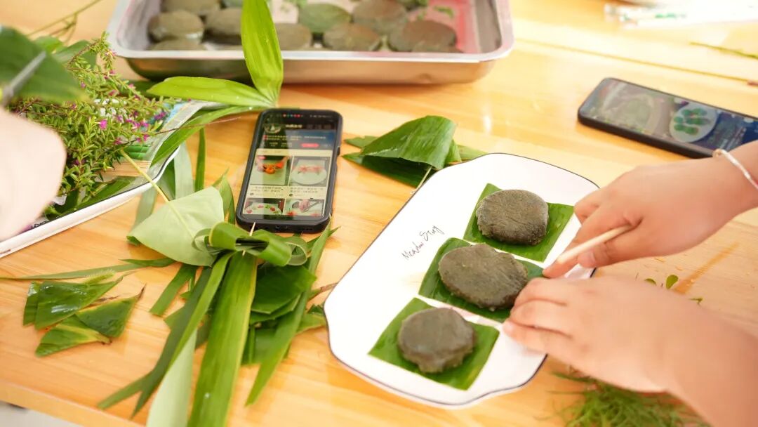 活动现场,行知小苑户外桌椅上摆放着精美的青团、艾草糍粑。帮帮团小导师一边邀请师生品尝,一边讲解制作工艺。软糯香甜的口感中,师生们不仅品尝到劳动成果的甘甜,更读懂了传统美食背后“顺应天时、物尽其用”的生存智慧。