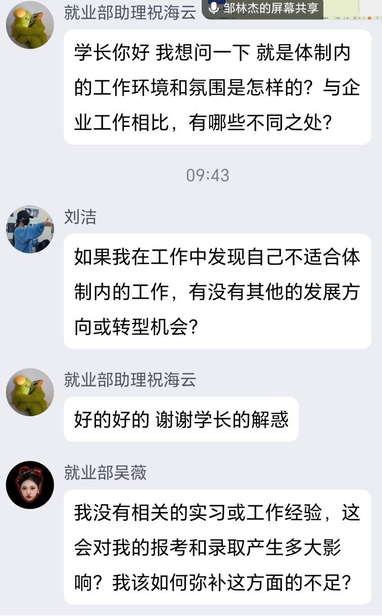 在答疑解惑环节,毕业生们积极参与,他们就工作环境、实习经历、岗位选择等方面提出了一些问题,针对同学们的问题,邹林杰与辅导员结合当前就业形势与行业动态,给予了切实可行的建议。