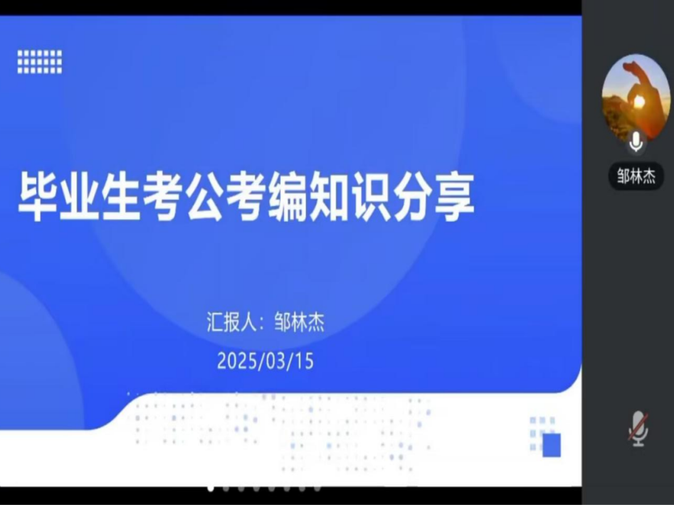 为帮助我院学生更好了解考公考编信息和最新形式,提高考公考编积极性,我院于3月15日举办了“优秀校友考公考编讲座”。此次讲座邀请我院优秀校友邹林杰老师进行线上分享,2025届毕业生辅导员单胡杨老师进行活动讲话,21级和22级部分学生参加。