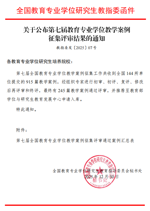 2025年12月30日,全国教育专业学位研究生教育指导委员会公布《第七届全国教育专业学位教学案例征集评审结果》。本届征集共吸引全国 144 家培养单位参与,累计报送教学案例 915 篇,经初审、初评、复评及终评等多轮严格遴选,最终仅 245 篇案例通过评审,获得全国教育专业学位研究生教育指导委员会入库资格,通过比例不足 27%,竞争十分激烈。
