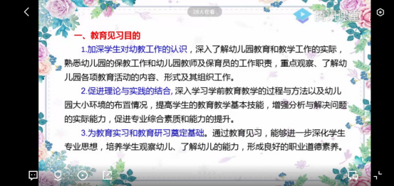 本次大会由学前教育专业负责人黎琦老师主持,2017级学前教育专业全体学生参与,黎琦老师通过本次会议对本次教育见习的内容安排与同学们的疑惑进行了详细解读与回答。本次线上教育见习主要包括几大方面内容:1.教学活动见习、2.班级管理工作见习、3.保育员工作见习、4.幼儿园环境创设见习、5.各组指导安排的其他各项活动。