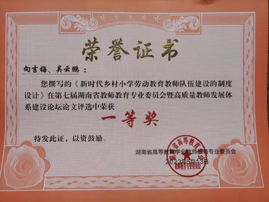 2023年5月12至14日,湖南省教师教育专业委员会暨高质量教师发展体系建设论坛“乡村振兴·人工智能·教师发展”于常德湖南文理学院召开。经专家评审,bv伟德国际1946研究生共有9篇论文获奖:其中(计第一作者)一等奖两名——舒佳楣、向吉梅;二等奖3名——郭鑫、曾慧、罗莉;三等奖4名——隆婷、黎利、张茜、戴橙(该论坛共收到136篇投稿,设定为一等奖20篇,二等奖30篇,三等奖40篇)。
