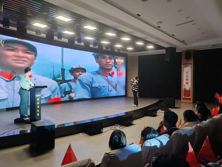 陆家新屋,展馆分为衡阳抗战陈列展览和居民复原展区,大量的照片、抗战时期的军用物品都是衡阳保卫战的抗战史实的记录者;复原区墙壁上的弹痕、弹孔,更是这场保卫战的见证,时刻警醒后人勿忘国耻,居安当思危。衡阳党史馆,在讲解员的生动解说下,全体党员重温了衡阳党史的发展历程,领会了中国共产党人的初心使命。观看《星火起湘南——衡阳音乐党史课》后,全体党员齐声合唱《没有共产党就没有新中国》,激发情感共鸣,将爱党爱国之音刻进血液里。
