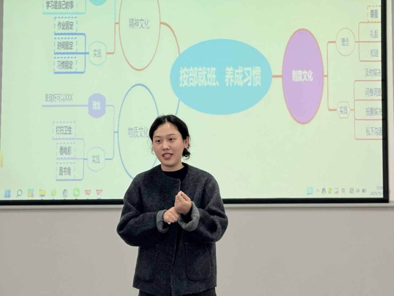 在经验分享环节,衡师附小三位优秀班主任围绕不同年级阶段的育人实践,分别展示了各具特色的班级文化建设成果。一年级钟老师以“接地气、有温度”为核心理念,介绍了课前口号、图书分享角、情绪信箱、亲子手帐等特色做法;二年级陈老师通过系统的PPT展示,从班情分析、文化建设主线、理念与实践及现存问题四个方面展开分享,其中“表现优秀获得劳动机会”的反向激励机制颇具创新性;三年级刘老师则凝练出“教、看、放”三字管理理念,强调规则引导、信任赋能与心态平衡的教育智慧,呈现了班级管理的系统思维。在随后的分组交流环节中,心理健康教育方向的研究生结合专业特长,就班级心理环境建设、学生关注度平衡、家校沟通等议题与班主任进行了深入探讨。交流尾声,陈老师以“阅读自己这本书”为喻,寄语同学们以积极心态和高能量姿态面对教育工作,本次见习在轻松愉悦的氛围中画上圆满句号。