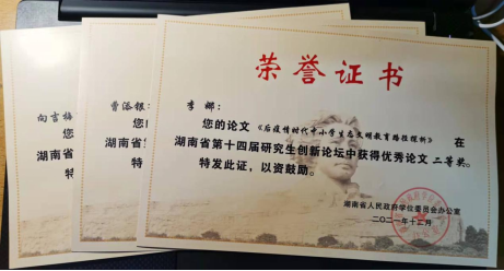 12月21日,教育管理方向3位研究生在湖南省第十四届研究生创新论坛“教育改革与教学创新”分论坛上所提交的论文获二等奖1项、三等奖2项,其中:2020级教育管理方向李娜提交的论文《后疫情时代中小学生态文明路径探析》获二等奖,2020级教育管理方向曹添银和2021级教育管理向吉梅提交的论文分别获三等奖。向吉梅代表我院研究生现场参加了论坛活动。