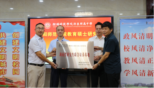 郑志辉院长和何敦培教授将“湖南省研究生联合培养基地”的牌子授予给副局长屈钟瑛和总支部书记王远明。随后郑志辉院长与教育科学研究院副院长邓育武对职业导师颁发了证书。