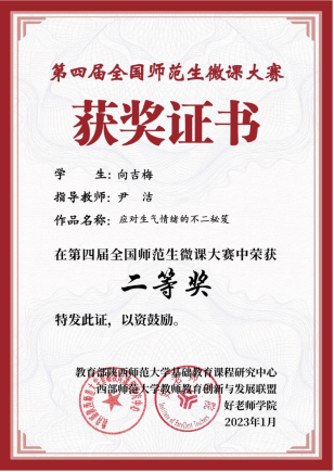 2023年1月4日,从全国师范生微课大赛官方平台传来喜讯,bv伟德国际1946教育硕士教育管理专业领域2021级研究生向吉梅制作提交的《应对生气情绪的不二秘笈》获二等奖1项,该作品是由尹洁老师精心指导的。